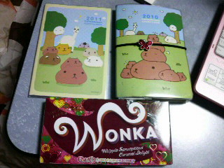 向かって左は来年の手帳、右は今年の。下は今年のウォンカチョコ(箱)。可愛い!!!
